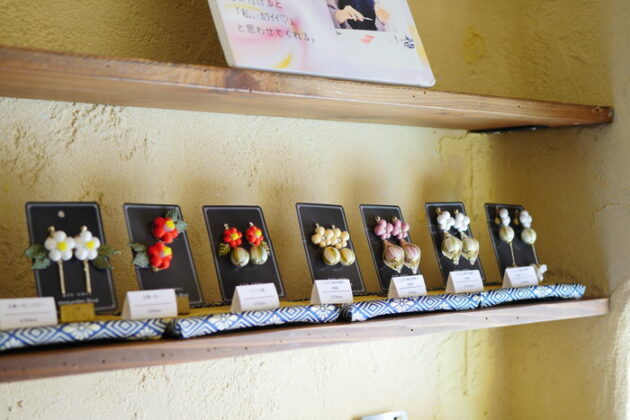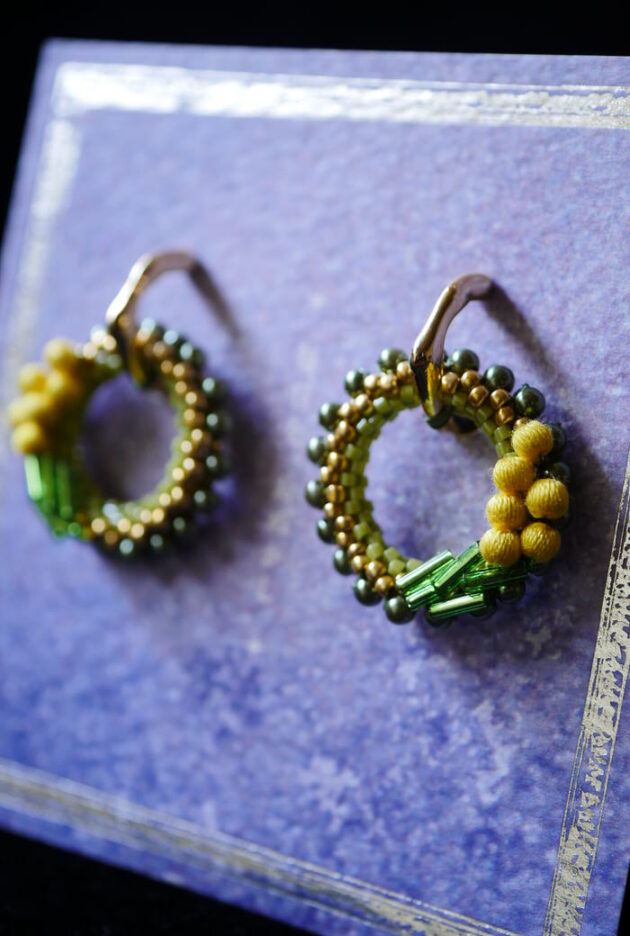 ウッドビーズに糸を巻きつけて作る『巻き玉』を使って、アクセサリーを制作しています。