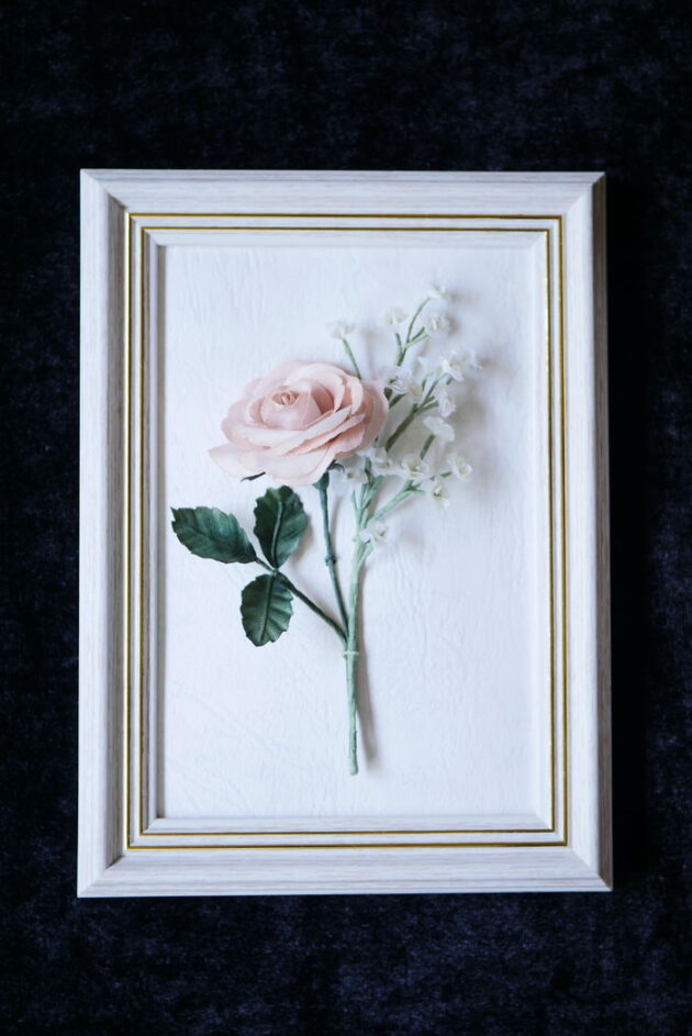 まずは、バラ×かすみ草の布花額装。